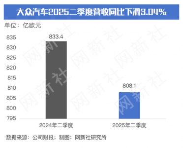 大众汽车集团近日公布2025年第二季度财务报告,数据显示公司营收与盈利双双出现下滑。报告期内,大众汽车实现营业收入808.06亿欧元,同比下降3.04%;净利润为21.74亿欧元,同比大幅下...