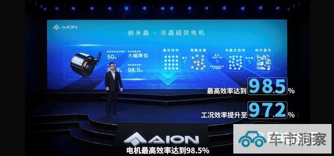 埃安电机团队从基础原材料和电磁原理创新开发,设计了一种“纳米晶-非晶”合金材料及批量制备工艺。相较于传统的铁基硅钢材料冶炼工艺,纳米晶-非晶材料冷却速度高达100万℃/s,较铁基硅钢材料快1000倍。埃安创新应用该材料制作电机铁芯,降低电机50%铁芯损耗,电机工况效率提升至97.5%,电机最高效率达98.5%。
