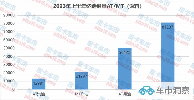 2023年1-6月,国内狭义皮卡终端销量中,自动挡车型的销量为63406辆,手动挡车型的销量为102546辆。自动挡车型占比已经达到38.21%,手动挡车型占比下滑至61.79%。皮卡乘用化已成事实。越来越多的消费者更愿意多花预算去购买自动挡皮卡。