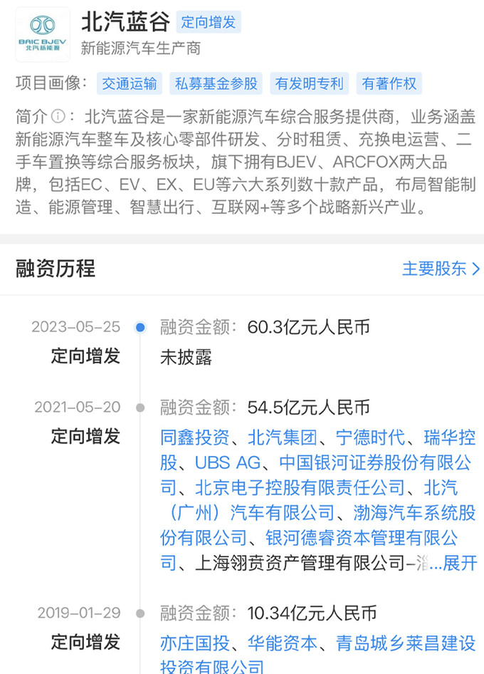 2019年至今,北汽蓝谷通过二级市场定向增发,共进行3轮融资,累计金额约125亿元。分别是2019年1月10.34亿,2021年5月54.5亿和2023年5月60.3亿。