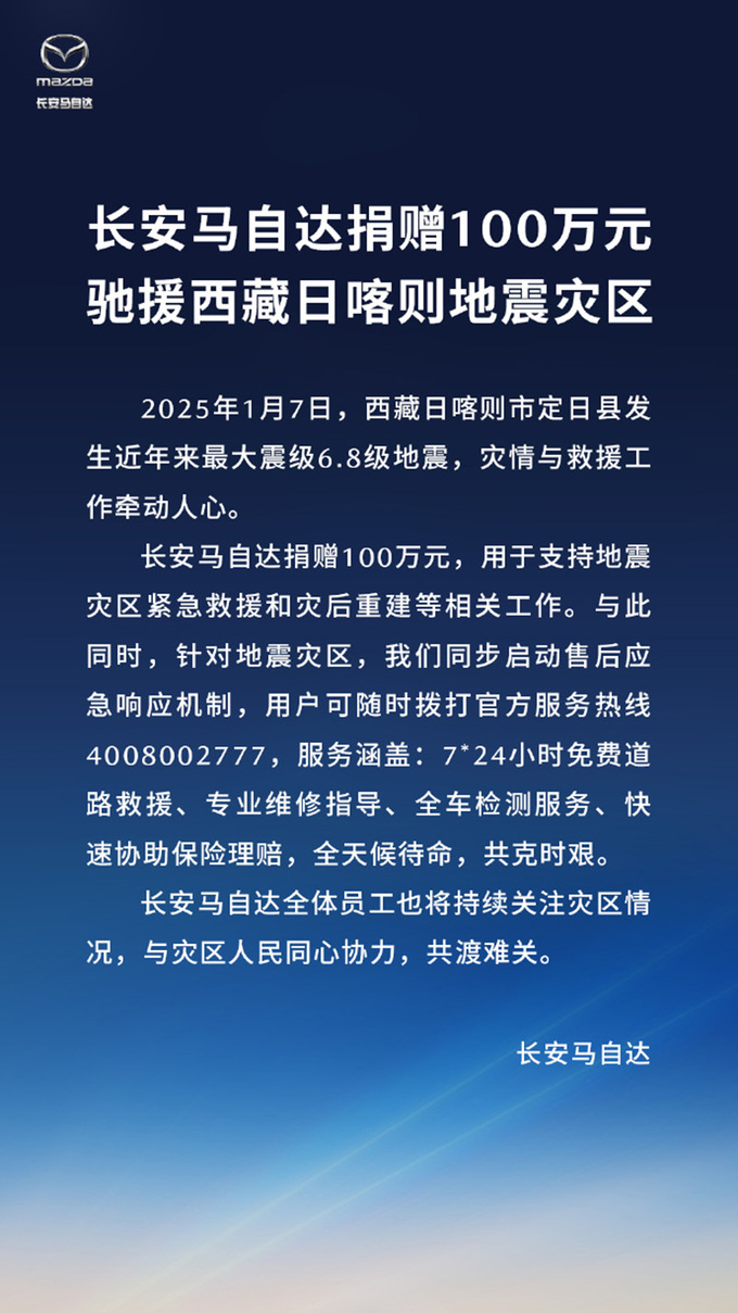 长安马自达捐赠100万元,驰援西藏日喀则地震灾区,同时售后应急响应全天候待命。