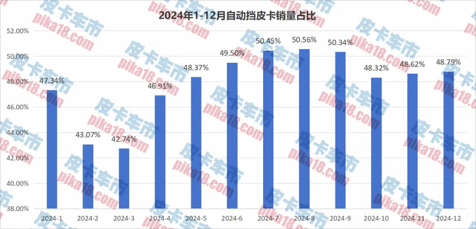 2024年12月,自动挡皮卡的终端狭义销量为12537辆,而手动挡销量为13148辆,自动挡占比为48.79%,微跌3.7%。2024年全年12个月自动挡皮卡销量为126784辆,同比微跌2.91%。