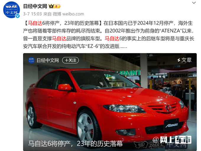 据日经中文网报道:马自达结束轿车马自达6的生产。日本本土生产线早在2024年12月就已关停,海外生产也将随零部件耗尽告终。