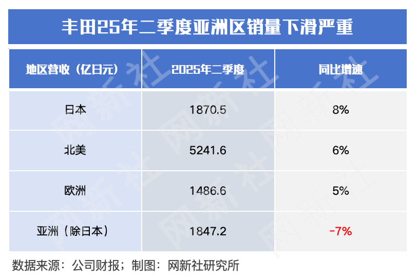 值得注意的是,这已是丰田连续第三个财年出现营收和盈利增速双双放缓的局面。其中,亚洲市场(除日本外)表现尤为惨淡,营业收入同比下滑7%至1847.2亿日元,成为所有区域市场中下滑最严重的地区。该地区业绩下滑主要受到当地品牌竞争加剧、消费者需求疲软以及电动车转型步伐缓慢等多重因素影响。
