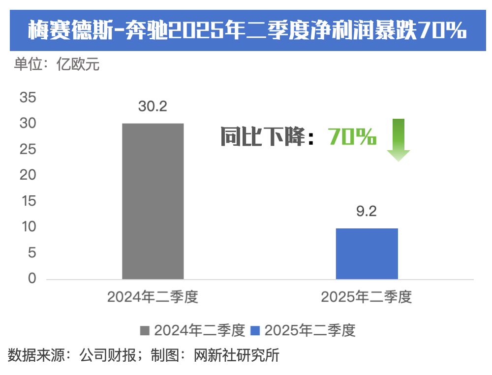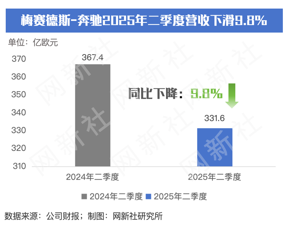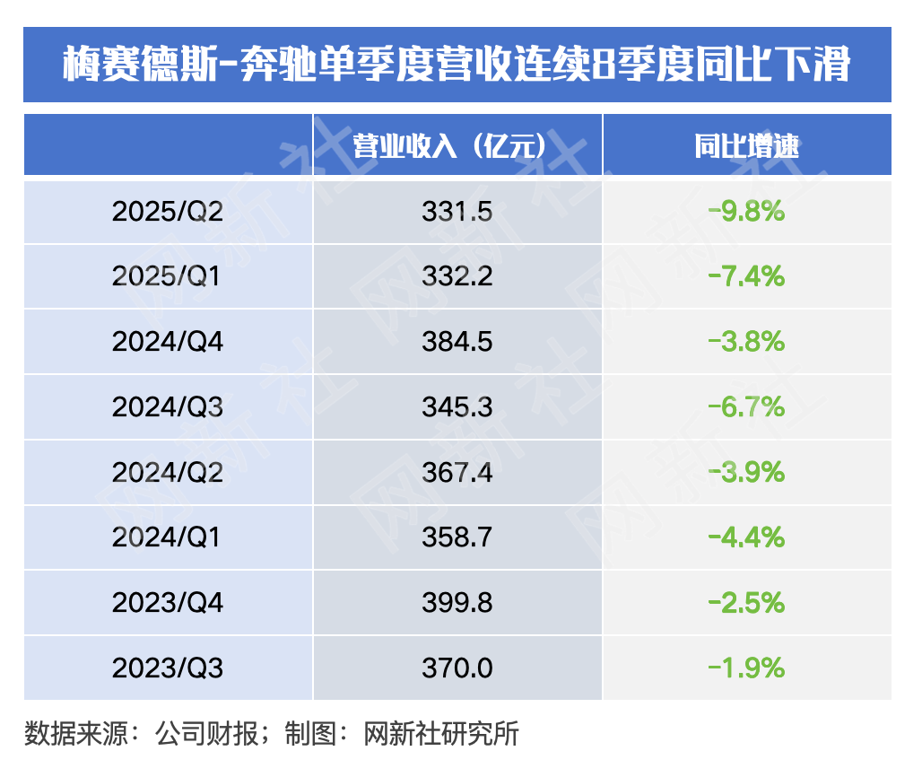 网新社研究所:梅赛德斯-奔驰集团近日发布2025年二季度财报。数据显示,2025年第二季度营业收入331.6亿欧元,同比暴跌9.8%,连续第八个季度出现负增长,且同比降幅持续扩大。更严峻的是,当季净利润仅9.2亿欧元,同比骤降70%,创疫情后单季最大跌幅。