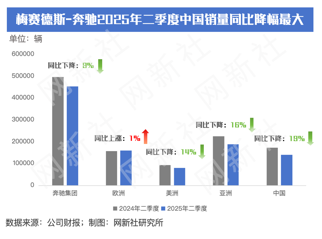 中国区市场增速下滑严重:二季度销量14万辆,同比下降19%,成为全球所有细分市场中下滑最严重的地区。公司表示,高端电动车市场竞争加剧及本土品牌冲击,导致其主力车型E级、S级在华销量锐减。