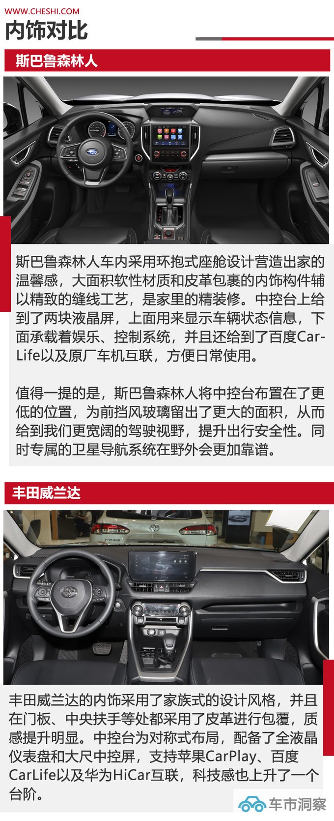 对比两款车的内饰来看,他们对于质感和舒适性的营造都非常出色,其中丰田威兰达在科技上的提升值得表扬,斯巴鲁森林人则是在驾乘舒适性和便利性上更胜一筹。