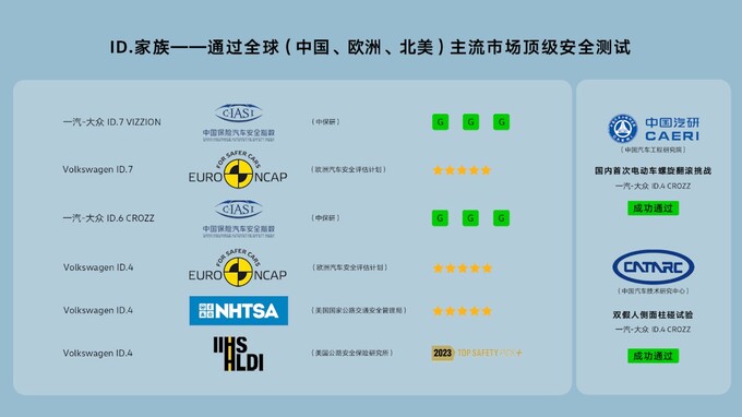 作为一款以“安全”为先的纯电旗舰轿车,ID.7 VIZZION除了获得本次C-IASI的安全性测试全优评价外,还在中央广播电视总台主办的“第四届中国汽车风云盛典”中获得“最佳安全车”的称号。作为一汽-大众ID.家族另一款产品,ID.6 CROZZ也在2023年度的C-IASI测试中,获得了“安全性测试全优,碰撞成绩0缺陷”的成绩,也充分验证了ID.家族的卓越安全性。