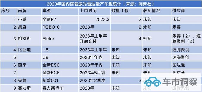 据不完全统计,全新小鹏P7、比亚迪仰望U8/U9、蔚来全新ES6/EC6、新款极氪001、赛力斯汽车、集度ROBO-01、路特斯Eletre等搭载激光雷达的车型将在今年陆续发布,为激光雷达行业注入新的发展动力。其中,速腾聚创将有多款定点车型实现量产,是否代表着其出货量会大增?