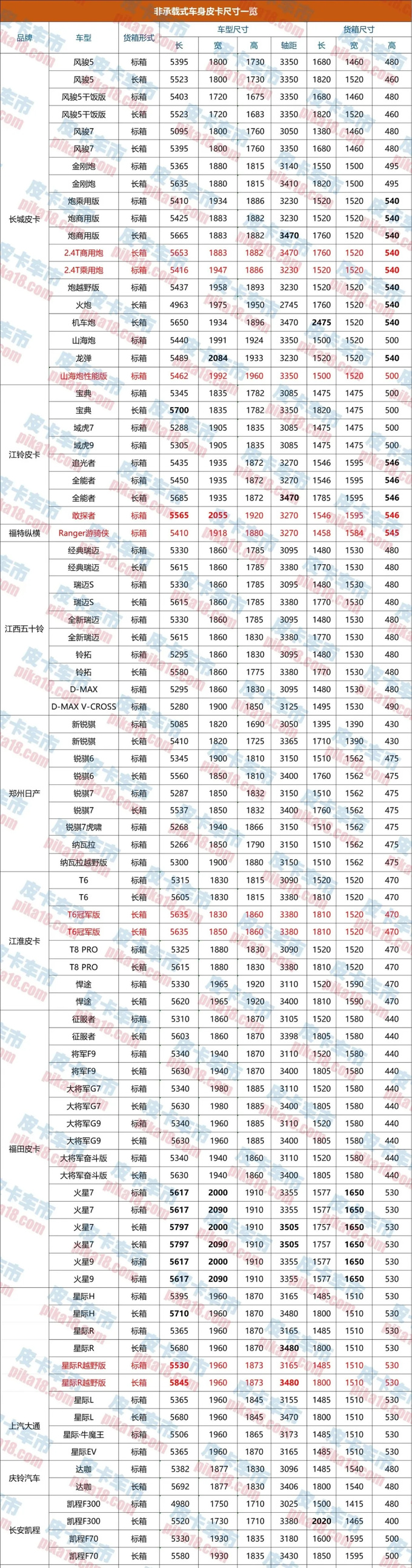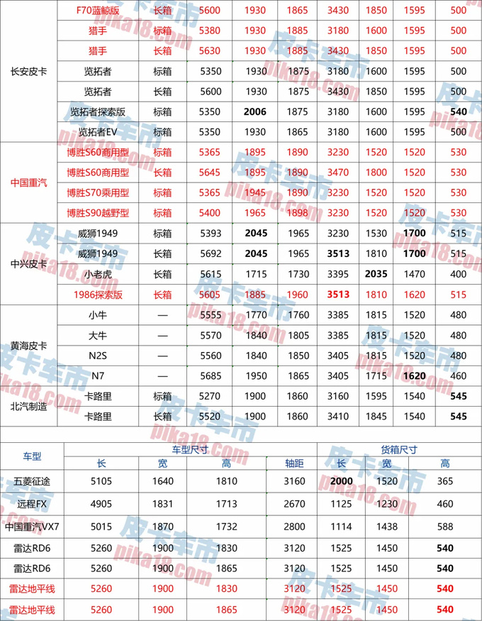 前几天我们盘点了今年上半年新上市皮卡的车身尺寸。为了让大家看得更加全面,今天将国产皮卡的车身尺寸和货箱尺寸全都整理到一张表格上,更直观地感受现在皮卡市场的尺寸趋势。