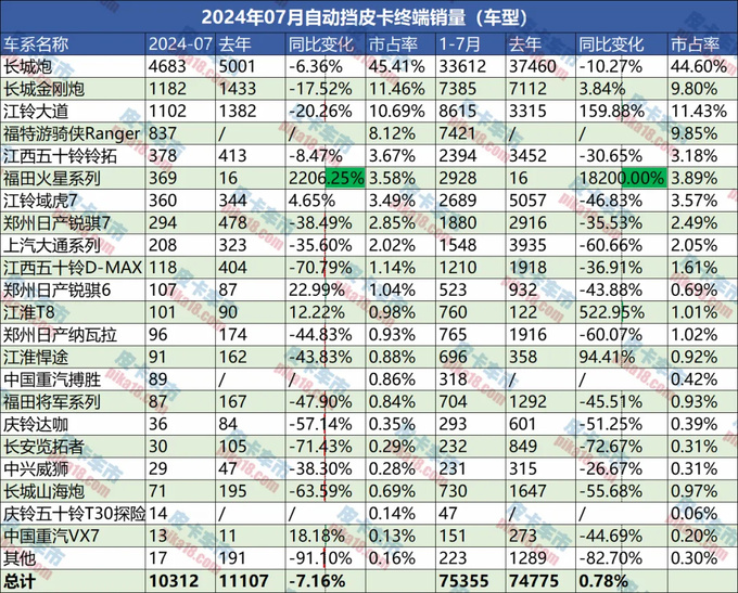 历史性一刻!在国内皮卡约40年发展史上,第一次自动挡皮卡的月销量超过了手动挡皮卡的月销量!7月自动挡皮卡的销量达到了10312辆,而本月手动挡皮卡的销量则为10127辆,自动挡皮卡占比达到50.45%。1-7月,自动挡皮卡的累计销量达到了75355辆,实现同比增长0.78%。而今年1-7月手动挡皮卡的累计销量则为83227辆,去年1-7月则达到了119253辆,同比下滑达到了30.21%!