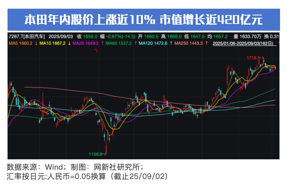 尽管面临经营压力,资本市场却表现出不同走势。2025年以来,本田股价累计上涨10%,市值增加6388亿日元(约420亿元人民币),显示出投资者对公司长期转型战略仍抱有一定信心。