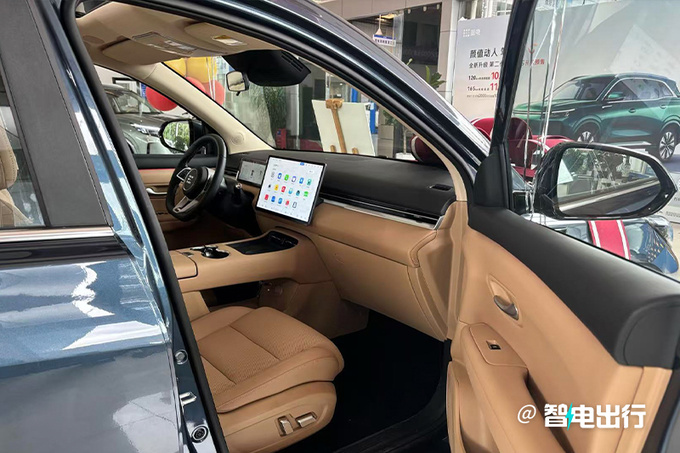 蓝电E5 PLUS车内搭载7英寸液晶仪表与15.6英寸中控屏(入门版为12.3英寸),车机采用HUAWEI HiCar 4.0系统,配备13扬声器音响、50W无线充电板、怀挡、256色氛围灯等。5座车型的第二排腿部空间达到了885mm,7座车型二排座椅可调节至119°的倾斜角度,第二、第三排座椅放倒后,最大容积可扩展至1694L。