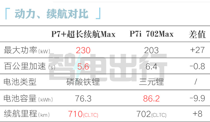 小鹏P7+搭载XPower电驱、X-HP智能热管理系统,标配3C电芯,兼容4C电芯,电机分为2种功率,分别匹配60.7kWh、76.3kWh磷酸铁锂电池,CLTC续航里程分别为602km、710km。