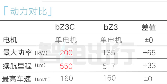 bZ3C搭载由弗迪动力提供的单电机,最大功率200kW,匹配65.28kWh与73.984kWh磷酸铁锂电池,CLTC工况下续航550km、630km。