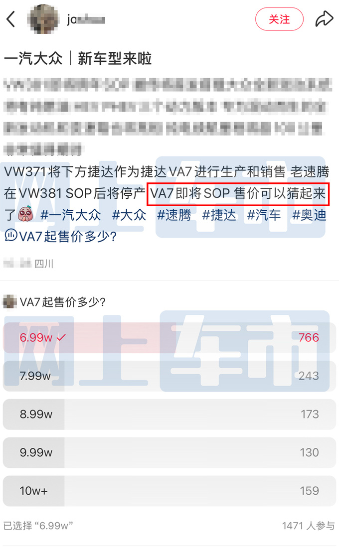 某国内TOP主机厂buyer(采购员)在社交平台上发起了VA7起售价竞猜,他的IP属地在四川,而一汽-大众的成都基地承担着捷达部分车型的生产任务,不排除他是捷达的一名内部工作人员。