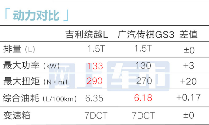 缤越L搭载1.5T发动机,最大功率133kW,最大扭矩290N·m,匹配7速双离合器变速箱,百公里油耗6.35L,动力比传祺GS3更强。