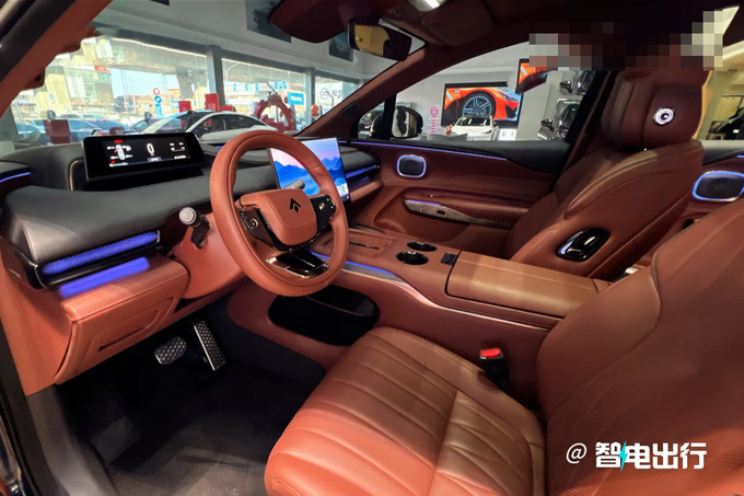 昊铂HL采用2+2+2式的座椅布局,提供红棕色内饰,配备平底双幅方向盘、17.3英寸悬浮式中控屏、27英寸全景HUD抬头显示、双大天幕(带遮阳帘)、超柔NAPPA真皮材质、悬浮式门把手、24扬声器音响灯。二排座椅提供127.5°的标准零重力角度,支持双固定扶手、18点按摩、12向电动调节等功能,能有效缓解疲劳。