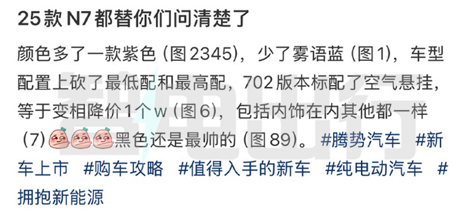 25款N7最大的亮点就是新增极光紫车色,搭配全新刀锋式轮毂,运动感直接拉满。销售表示,25款已到店,全系搭载高阶智驾系统,将取消最低配(550智驾Pro)和最高配(四驱智驾Ultra),702版本标配空气悬架,20万买它可以吗?