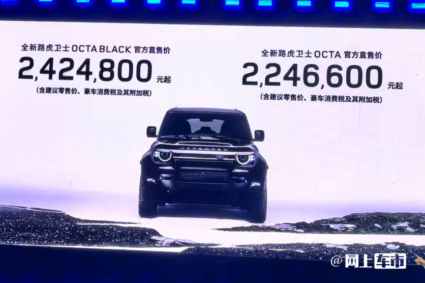 路虎宣布:全新卫士0CTA和OCTA BLACK的官方直售价分别为224.66万元和242.48万元(均含豪车消费税及其附加税)。