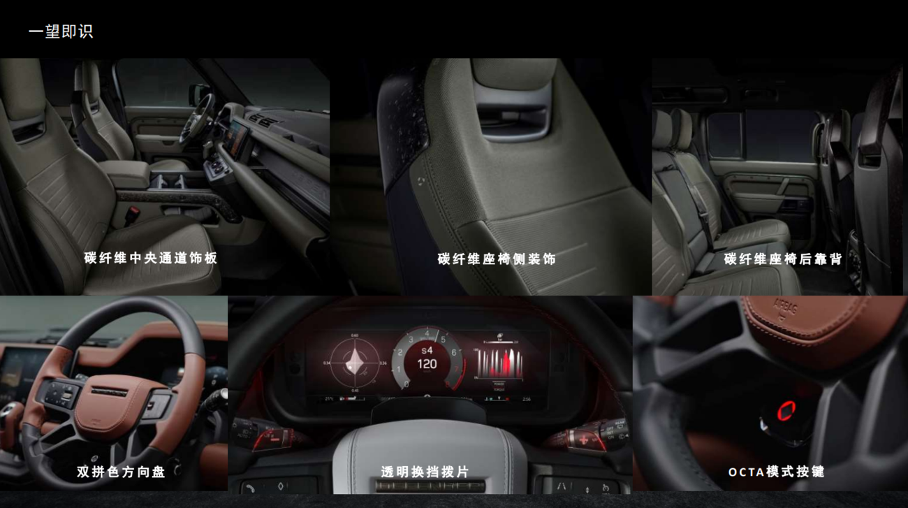 OCTA是卫士的极致形态,该模式搭载专为松散砾石路面而设计的独特刹车校准功能。它采用全新设计的保险杠和进气格栅,宽体的加入,使车身加宽68毫米,高了28毫米,车内外使用大量的碳纤维材质,这也是其显著区别于常规版本卫士的地方。OCTA BLACK车型采用极境黑专属外观并搭配扩展黑色外观套件。