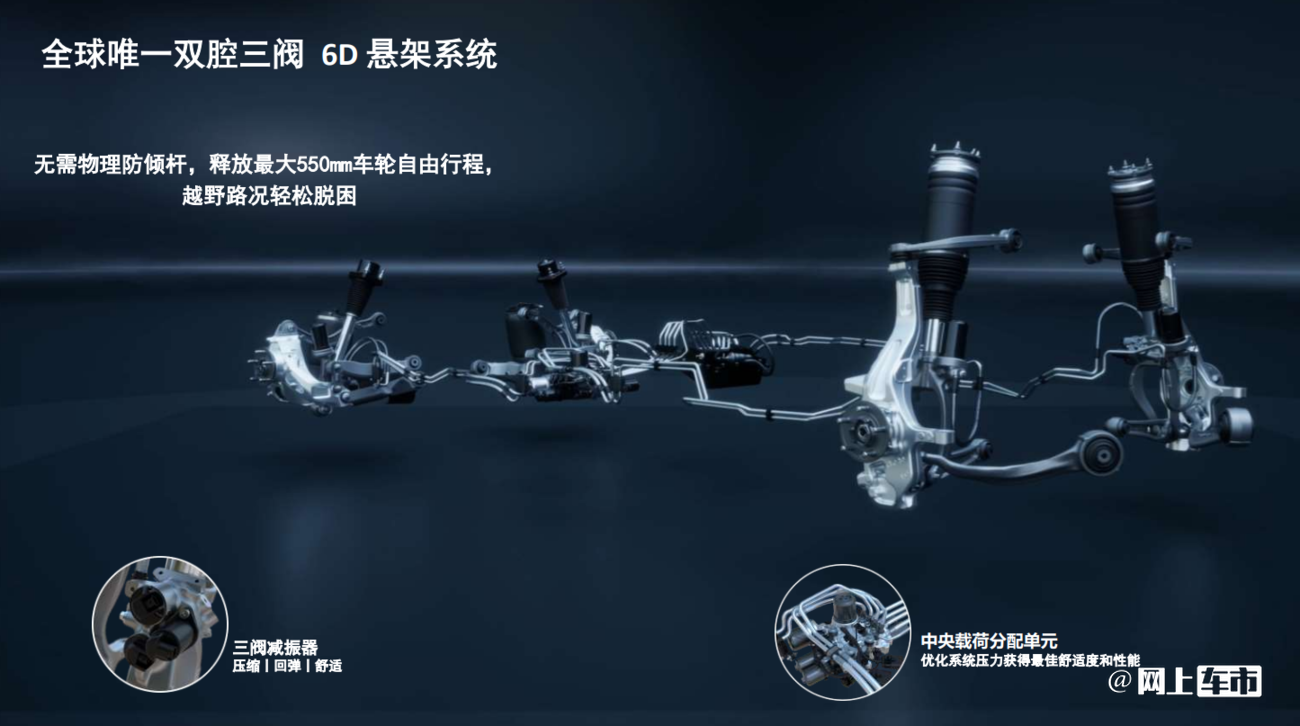 双腔三阀空悬6D底盘,通过液压互联减震器与高度可调空气弹簧的协同作用,智能适应不同驾驶风格。过弯不侧倾、湿滑路面不横摆,颠簸坑洼路面依旧保障舒适性。