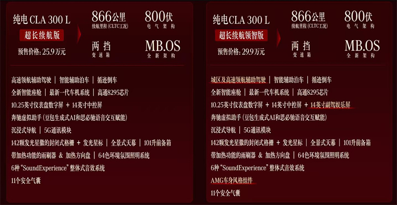 一方面,在面对价格重叠的Model 3时,全新纯电CLA胜在了豪华氛围与续航水准。另一方面,在年轻市场里,面对小米SU7等新势力时,其也有着前者尚未形成的真·豪华品牌积淀。而领智版的AMG套件和城区领航辅助驾驶,也强化了全新纯电CLA在运动感和智能化的“差异性”。