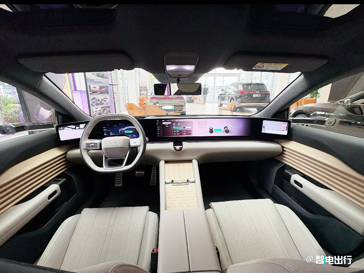 座椅坐垫的纹理,以及门版内侧的装饰,都是这种竖条式设计,拉长了纵向视觉效果。搭配平底式方向盘和59英寸的一体式大屏,让整个前排座舱看起来非常宽敞。